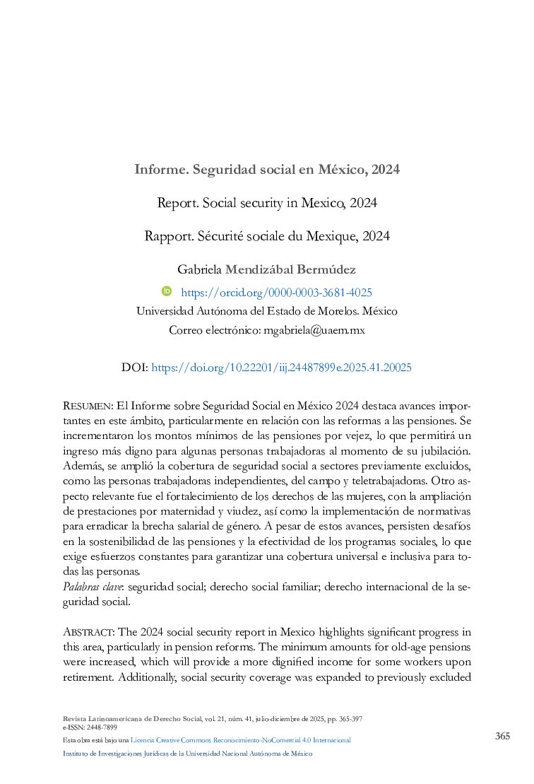 Por Gabriela Mendizábal Bermúdez El Informe sobre Seguridad Social en México 2024 destaca avances impor-tantes en este ámbito, particularmente en relación con las reformas a las pensiones. Se incrementaron los montos mínimos de las pensiones por vejez, lo que permitirá un ingreso más digno para algunas personas trabajadoras al momento de su jubilación. Además, se amplió la cobertura de seguridad social a sectores previamente excluidos, como las personas trabajadoras independientes, del campo y teletrabajadoras. Otro as-pecto relevante fue el fortalecimiento...