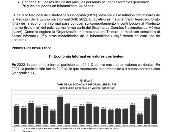 El Instituto Nacional de Estadística y Geografía (INEGI) presenta los resultados preliminares de la Medición de la Economía Informal (MEI) 2022. El objetivo es medir el Valor Agregado Bruto (VAB) de la economía informal para conocer su comportamiento y contribución al Producto Interno Bruto (PIB) del país. La MEI forma parte del Sistema de Cuentas Nacionales de México (SCNM). Como lo sugiere la Organización Internacional del Trabajo, la medición considera el sector informal (SI)3 y otras modalidades de la informalidad (OMI) 4 dentro de este tipo de economía.