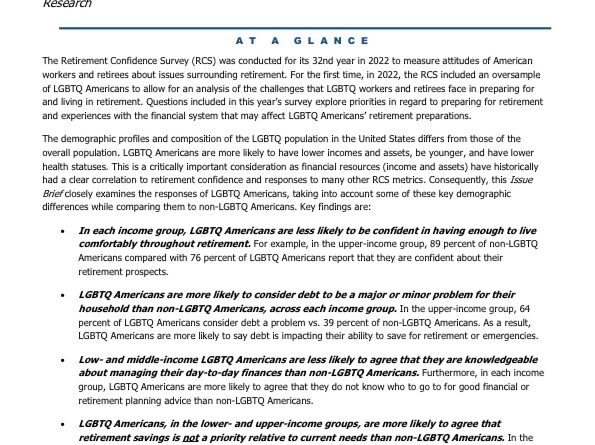 The Retirement Confidence Survey (RCS) was conducted for its 32nd year in 2022 to measure attitudes of American workers and retirees about issues surrounding retirement. For the first time, in 2022, the RCS included an oversample of LGBTQ Americans to allow for an analysis of the challenges that LGBTQ workers and retirees face in preparing for and living in retirement. Questions included in this year’s survey explore priorities in regard to preparing for retirement and experiences with the financial system that may affect LGBTQ Americans’ retirement preparations.