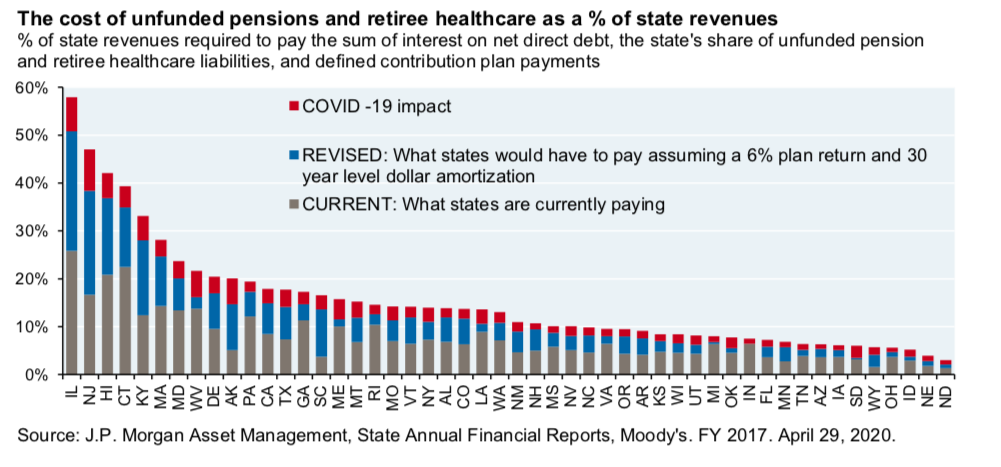 Banking giant J.P. Morgan issued a report estimating the impact of the COVID-19 pandemic and economic downturn on states’ unfunded pension and retiree healthcare liabilities, noting Connecticut would have to pay nearly 40 percent of its revenue for the next thirty years to pay off nearly $70 billion in unfunded liabilities.